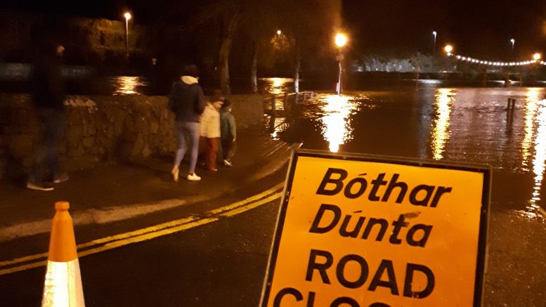 The River Slaney has burst its banks in Enniscorthy town centre tonight and Templeshannon Quay which accommodates the N11 Dublin to Wexford road is closed to all traffic.