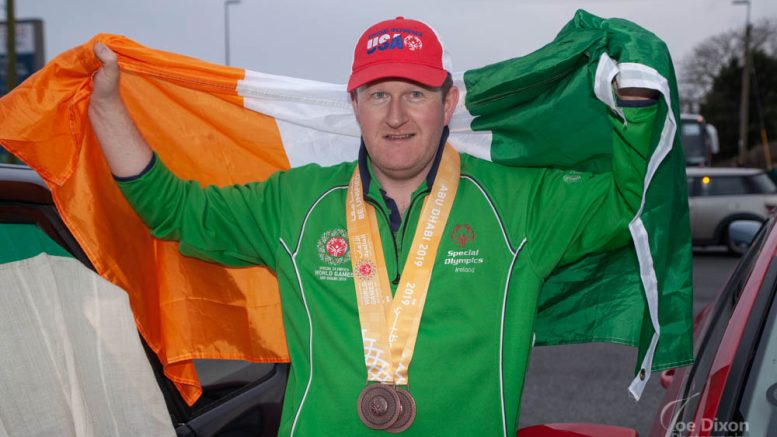 JOHN DOYLE. Winner of two bronze medals at the Special Olympics World Games in Abu Dhabi celebrates as he arrives back in Gorey. (Pic; Joe Dixon Photography).
