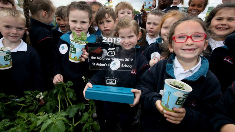 The students from St. Aidan’s National School in Enniscorthy are announced as the GIY and innocent drinks ‘Big Grow’ Champions 2019. Mr Foley’s senior infant class attended the Bloom festival where they were presented with their award.