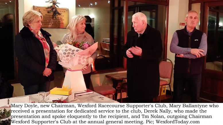There is major change at the top of the Wexford Racecourse Supporter’s Club following the annual general meeting held in the Ivy Room, Wexford Racecourse, on Friday night with Mary Doyle replacing Tim Nolan as Chairman of the group having served his statutory three year term in the chair.