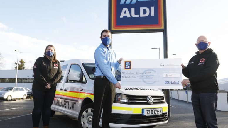 Kathrina Doyle & Jim Delaney of Wexford Marine Watch receiving a €500 Donation from Aldi Wexford Charity Champion Luke Walshe as part of Aldi’s Community Grants programme, which helps fund local charities and organisations that contribute vital work and services in their local communities.