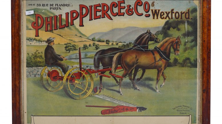 A stunning advertising poster for Philip Pierce and Co, Wexford town of a horse-drawn mowing machine pictured in the Vale of Avoca is expected to make between €1,500 and €2,500 at Sheppard’s of Durrow online auction.